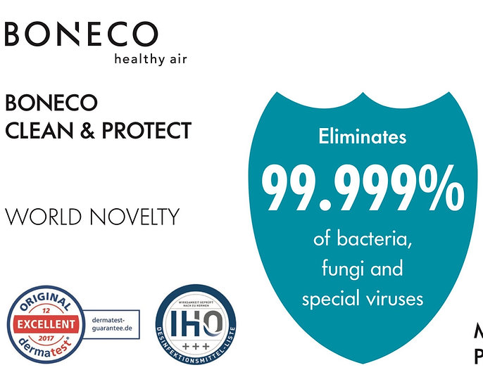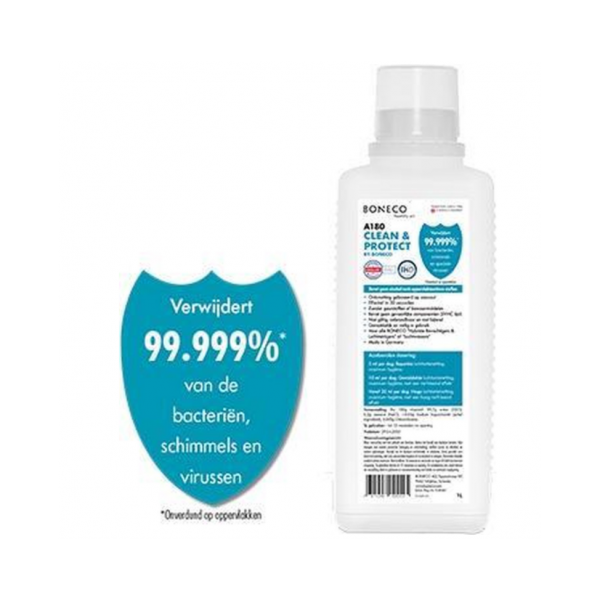 Boneco A180 Clean & Protect - zorgt voor een kiemgereduceerde en gezonde binnenlucht Of het nu thuis, op kantoor, in openbare ruimtes, scholen, commerciële ruimtes of in de hotel- en horecasector is, de BONECO Clean & Protect biedt extra veiligheid. Dit hygiënemiddel op zeezoutbasis zorgt in combinatie met een hybride luchtbevochtiger, luchtzuiveraar of luchtwasser voor een kiemgereduceerde binnenlucht. Het reduceert binnen twee uur tot 50% van de virussen en bacteriën, en dat alles zonder alcohol, tensiden, geur- of conserveringsmiddelen. Bij een luchtvochtigheid van 20% blijven infectieuze virussen tot 4 à 5 uur na het hoesten in de kamer. Juist in tijden als deze, die voor ons allen een uitdaging vormen, moesten we leren leven met het coronavirus. Boneco is al meer dan 60 jaar expert op het gebied van mobiele binnenoplossingen - altijd met het doel om te voldoen aan de hoogste kwaliteitsnormen. De toepassing is heel eenvoudig en veilig: Geef de aanbevolen dosering in het waterreservoir en Clean & Protect werkt al binnen korte tijd (30 seconden). Doseringsaanbeveling: 5 ml per liter: Geringe luchtdesinfectie, maximale hygiëne 10 ml per liter: Middelmatige luchtdesinfectie, maximale hygiëne + frisheidseffect vanaf 20 ml per liter: Hoge luchtdesinfectie, maximale hygiëne + sterk frisheidseffect Kenmerken: Voor alle hybride luchtbevochtigers, luchtzuiveraars of luchtwassers Desinfectie op zeezoutbasis Werkt binnen 30 seconden Verwijdert 99,999% van alle bacteriën, schimmelsporen en speciale virussen Inhoud: 1 liter Niet toxisch, niet brandbaar en niet corrosief Geen geur- of conserveringsmiddelen Bevat geen gevaarlijke bestanddelen (SVHC-lijst) Eenvoudige en veilige hantering Veiligheidsinstructie: Gebruik biociden voorzichtig en lees vóór gebruik altijd het etiket en de productinformatie. (Boneco A180 Clean en Protect)